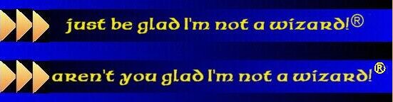 The trademark registrations for both "Aren't you glad I'm not a wizard?" and "Just be glad I'm not a wizard!" are expiring. I have been retired for a few years now, and do not, at this time, plan to tread the boards again. For this reason, I have decided not to renew the trademark registrations for these lines.
